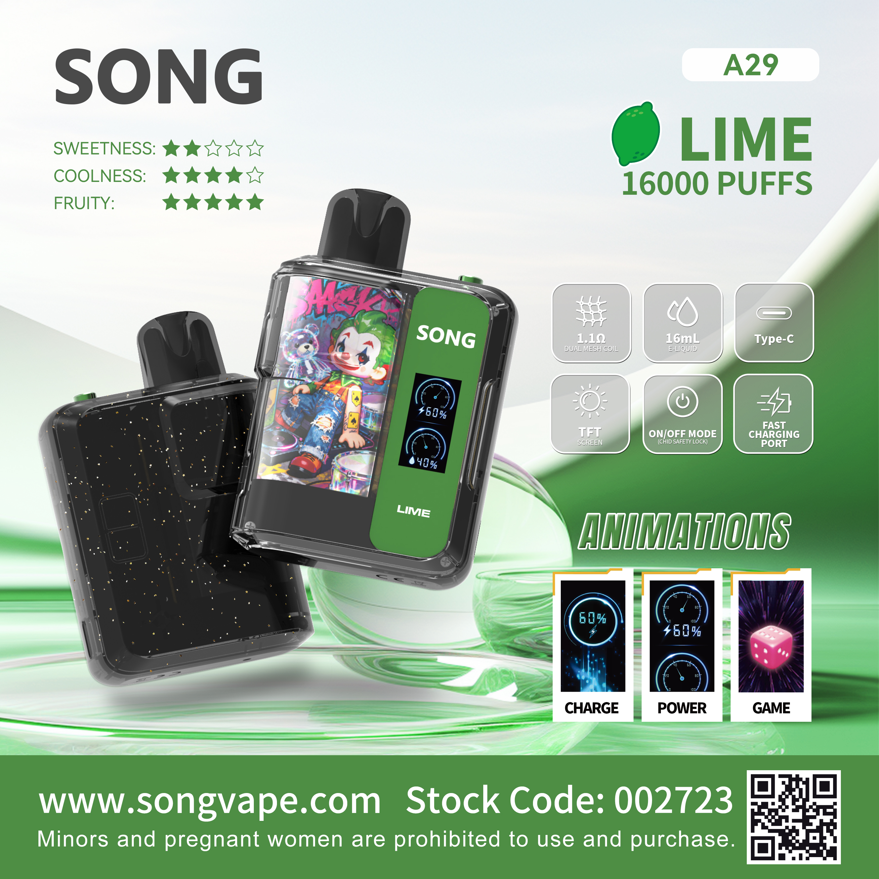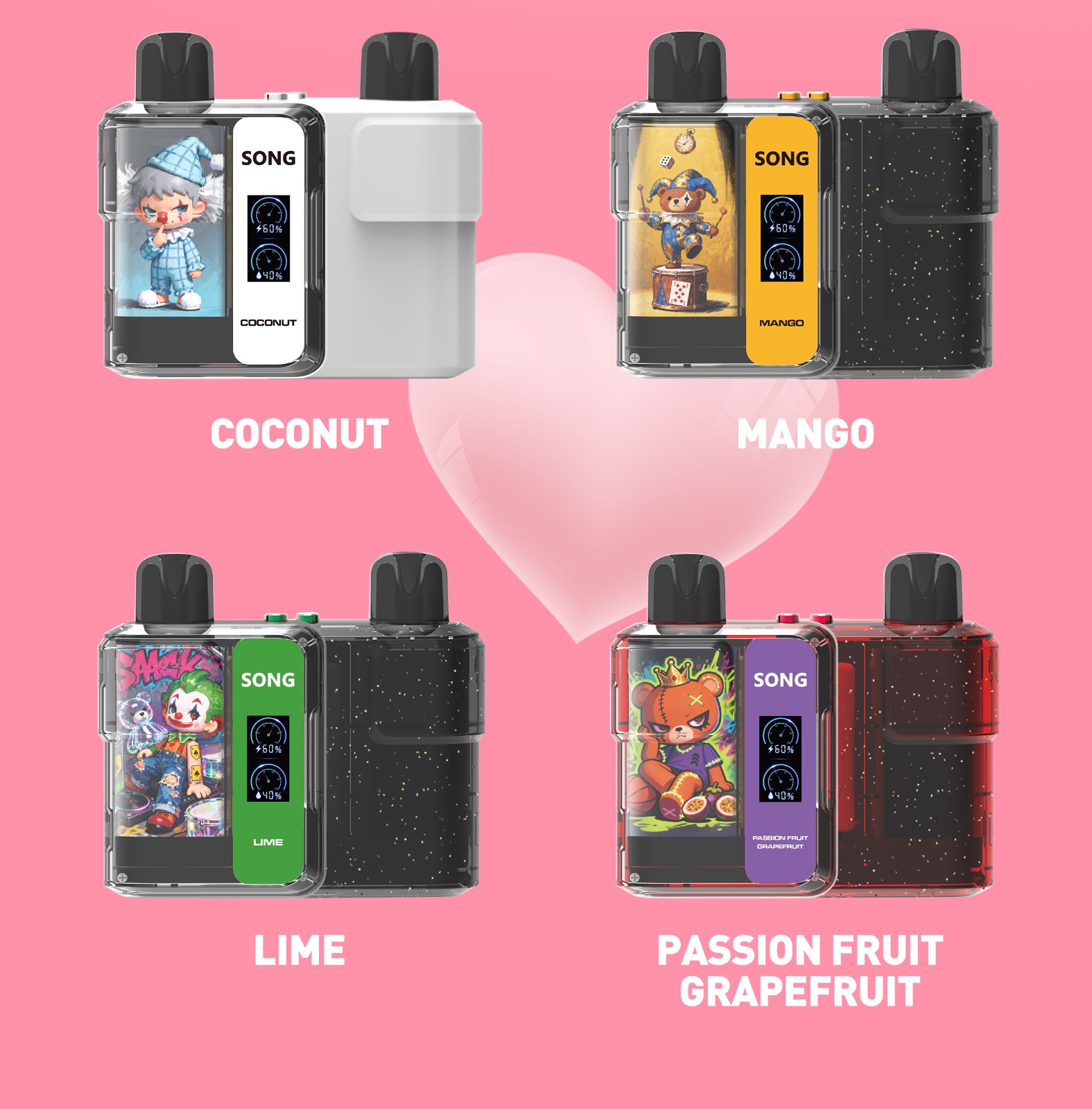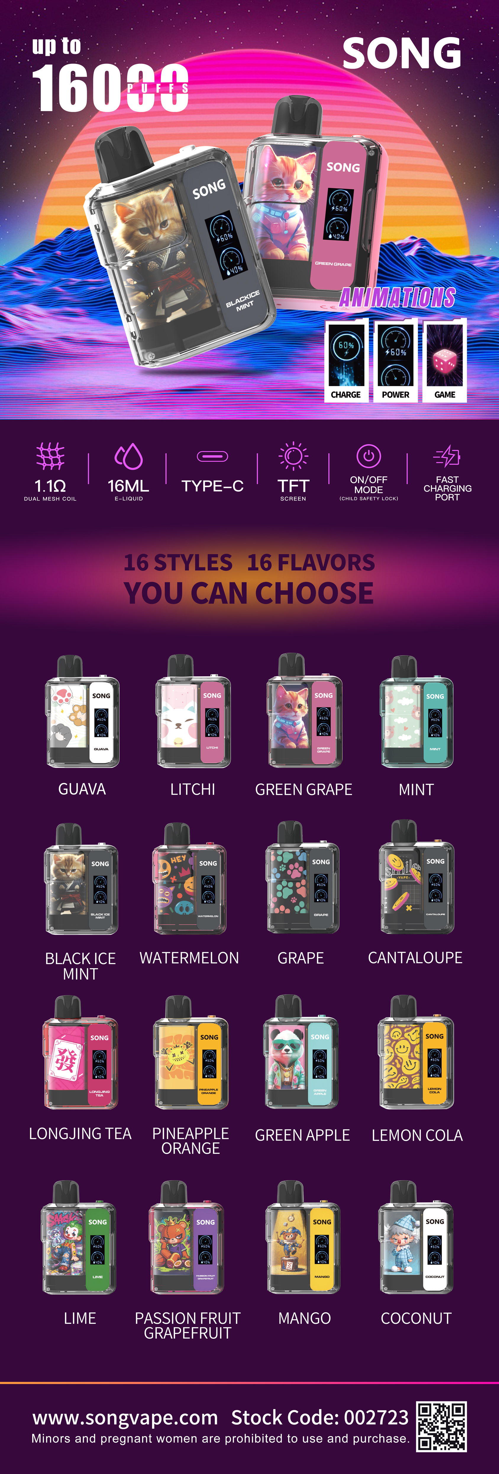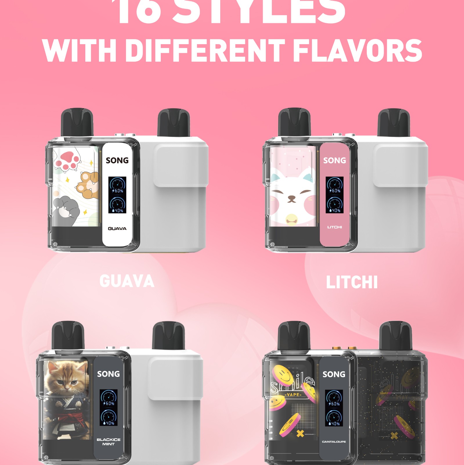 Guava/Litchi/Black Ice Mint/Grape/Cantaloupe/Green Grape/Mint/Longjing Tea/Watermelon/Lemon cola/Pineapple orange/Lime/Passion Fruit Grapefruit/Green Apple/Coconunt Ice